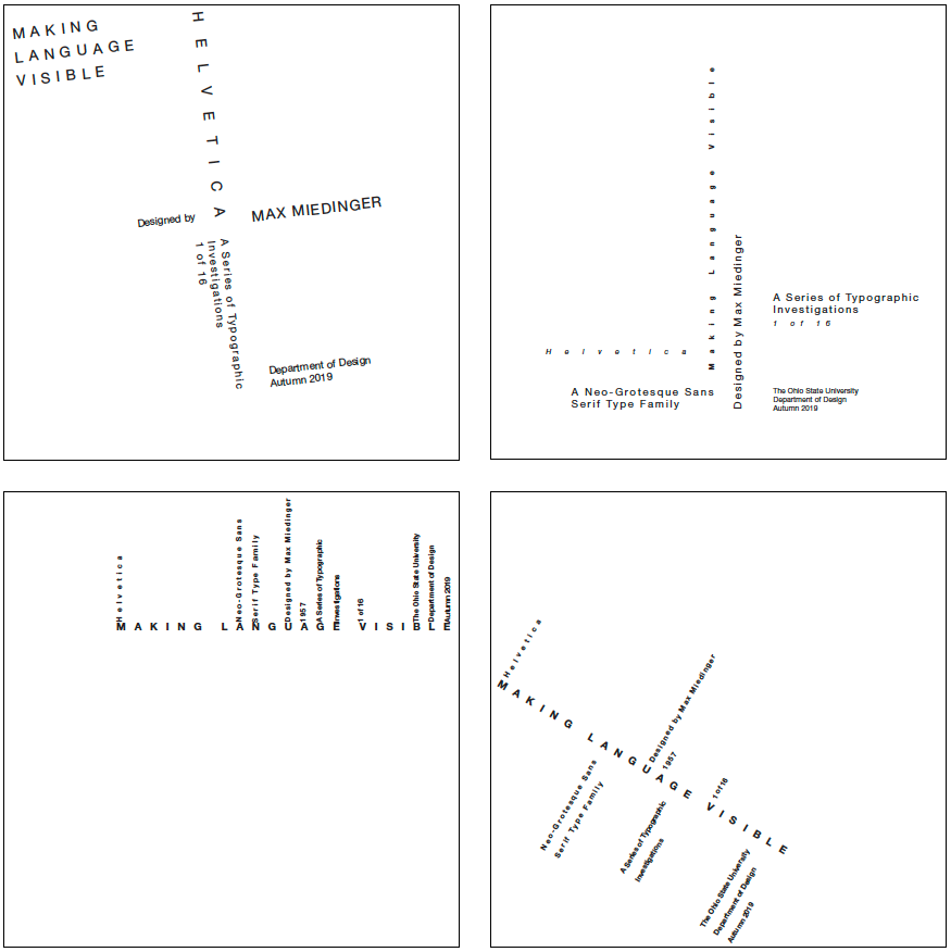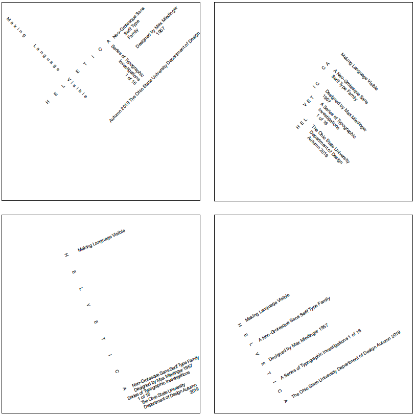 This section had us orienting a sentence describing our typeface in various ways on a square composition, with evolving guidelines for each work.